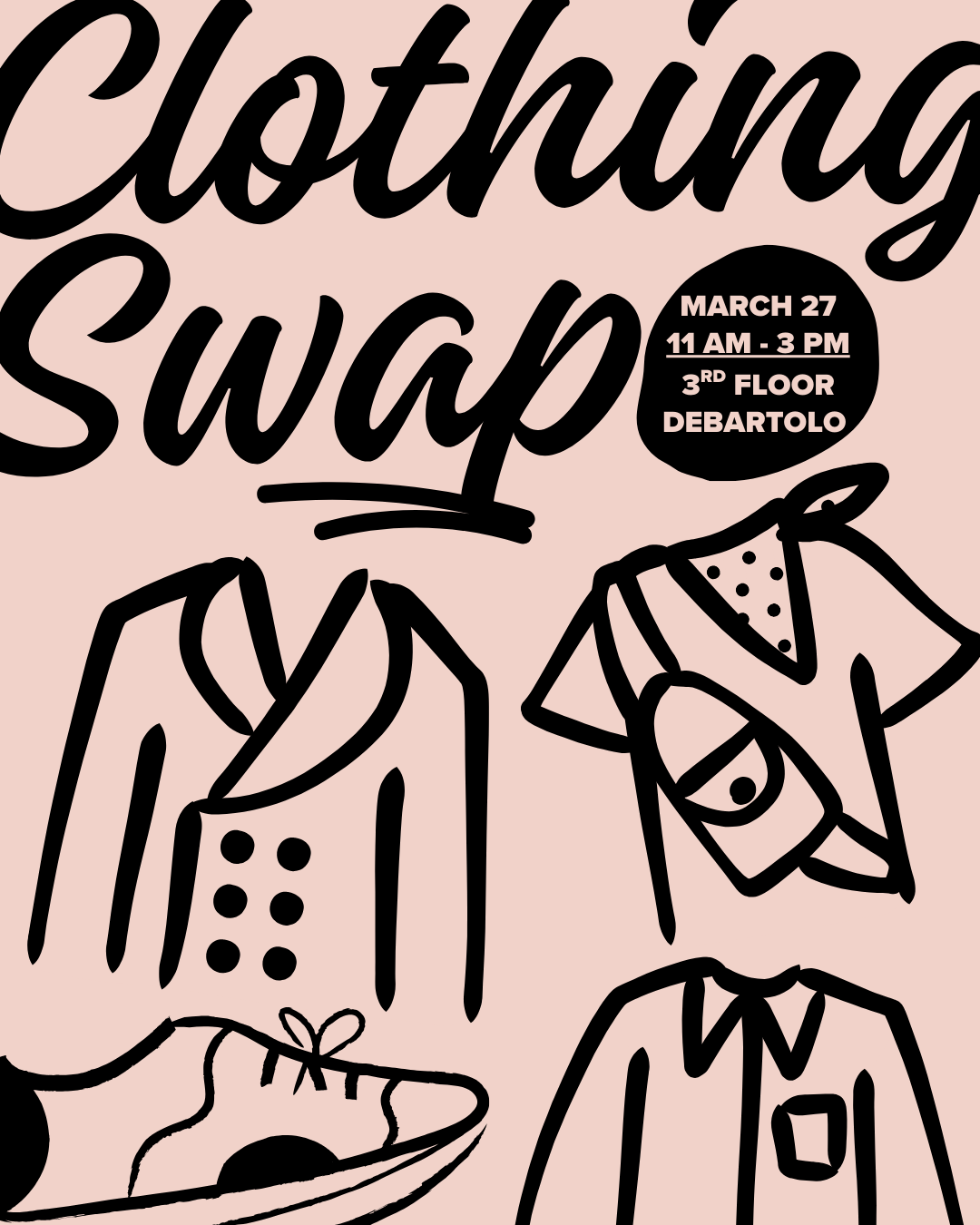 decorative image. square image of outlines of clothes on a peach-colored background. The text reads "Clothing Swap March 27 11 AM to 3 PM 3rd Floor DeBartolo"